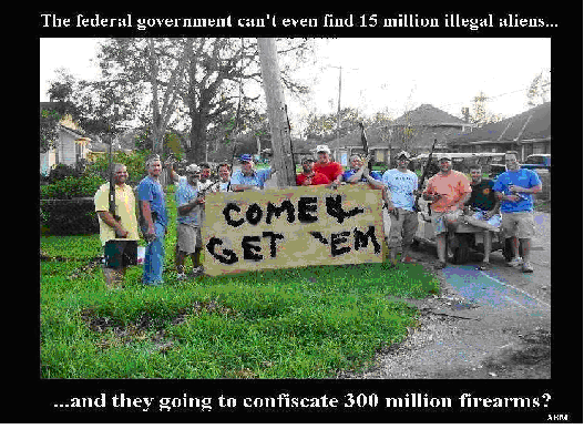 Let's look at one of the Big Lies by the gun grabbers. There is no "gun show loophole". What a load! Buying a gun at any gun show in America is the exactly same thing as buying one in a gun store. Same rules and regulations. No one at a gun show is going to sell you a gun without paperwork and risk losing his business. The proposed laws will liter-ally prohibit private sales of any gun, or even parents giving guns to their children or relatives. Just like the "no fly list", there would be a "no gun list" at the discretion of the government. Your Second Amendment rights (what is left of them) would disappear at the flick of a pen. with no rhyme, nor reason. No explanation and no appeal. If even a mistake was made (think of all the people with the same names like John Smith), too bad for you. Buy your guns now. Get any semiautomatic rifle you want. AK-47s are your best bet overall price wise. Get all the large capacity magazines you want. Most of all, load upon ammunition. It lasts for 50 years with no problem. The ammo will be the first to go. Already legislation is being passed that you must buy ammo in person, and not by mail or on the Internet. It's better to have one gun and 1,000 bullets, than 1,000 guns and 1 bullet. Yes, we'll keep repeating that. Our apologies for calling semiautomatic rifles "assault" rifles. A real assault rifle has selective fire, and is fully automatic or semiautomatic as you choose. Many teenagers and hunters have semiautomatic .22 rifles, and they aren't called "assault weapons".