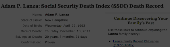 The official Social Security Death Index reports Adam Lanza died one day before he supposedly killed 26 people. Folks, these are government figures. No one has seen Adam for the last three years. He could well have died in 2010.