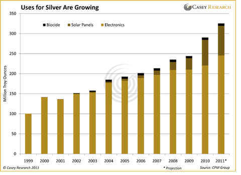 Look at the above chart (thanks to Casey Research). We cannot do without silver. We can do without gold, but not silver. New uses for silver have tripled in the last 20 years. Aside from the fact silver is real money, we simply cannot have a society without silver. No, you cannot replace it, except with super expensive elements like platinum and gold.